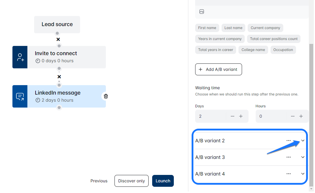 - In Sustainable Advertising, you can test different parts of your message copy, such as LinkedIn messages, Emails, InMails, Invites to Connect, or even the timing between the steps during the campaign sequence creation process. You can create up to 5 different test variants!