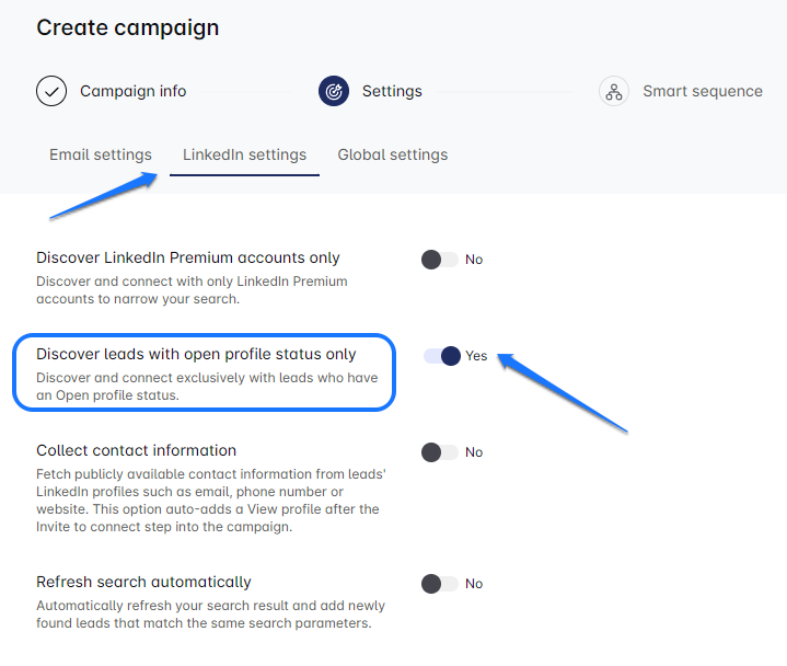 - Enabling "Discover Leads with Open Profile status only" will narrow your search focus, so don't hesitate to cast a wide net when setting up this type of campaign.