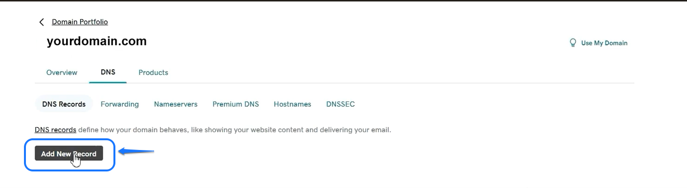 🔔 For GoDaddy, go to Domains>Portfolio>DNS>DNS Records.